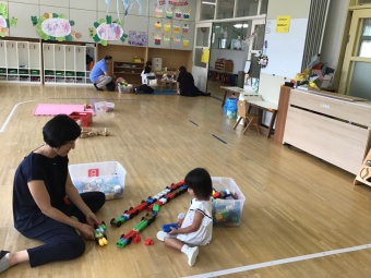 今日は親子体操を楽しんだ後、シャボン玉遊びをしたり、広い庭で遊んだり、保育室を開放して好きな遊びをしたりして、過ごしていただきました。