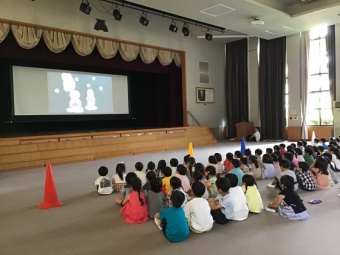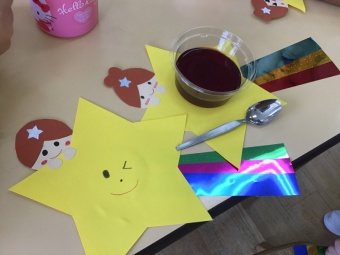 講堂での七夕の会が終わった後は、そのままチームに分かれて、お手伝いの保護者の方が作ってくださったゼリーをいただきました。ゼリーの下には織り姫と彦星の可愛い七夕コースターがあり、子どもたちはとても嬉しそうでした♥