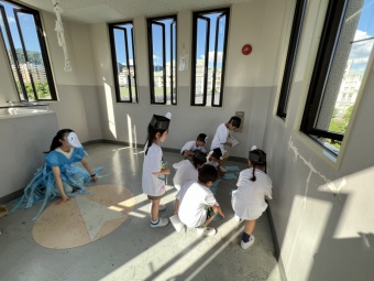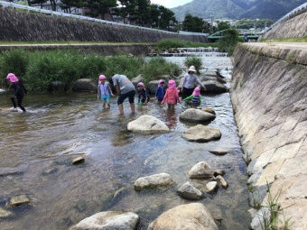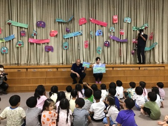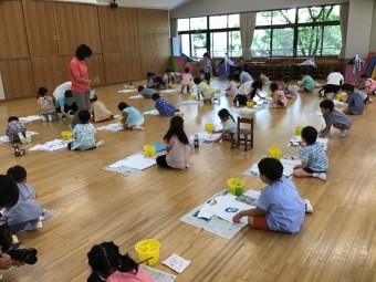 このテーマを基に小学校探検や夜のお楽しみ会などを楽しみました。その他にも思い出作りにTシャツ作りや近所の住吉川にも遊びに行くなど、盛りだくさんの2日間でした。この2日間を楽しんでくれたようで「もっとお泊まり保育したい~!!」と最後は名残惜しそうな子ども達でした。
