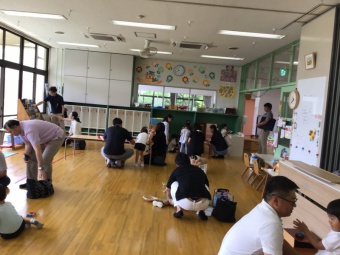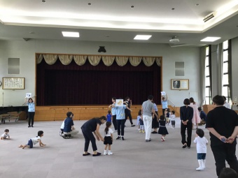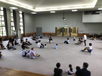 今日は講堂でクイズ遊びや動物になって動いたり、紅白の玉を使って遊んだりしました。その後、保育室での室内遊びや園庭での水遊びやお庭遊びなどを楽しんでいただきました。来てくださってありがとうございました。