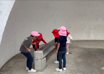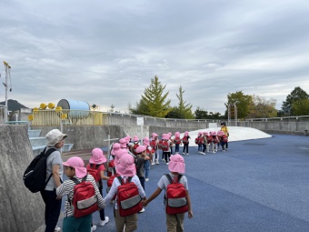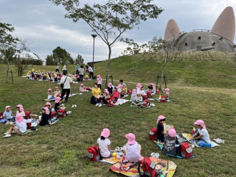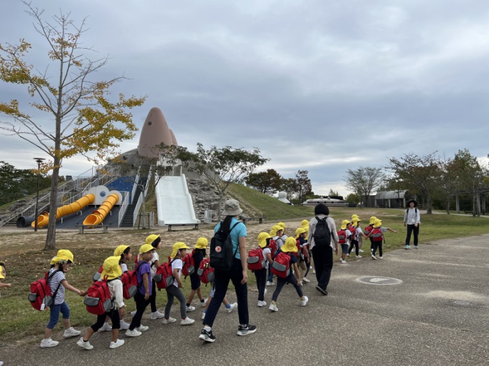 今日は、三田市にある有馬富士公園へ遠足に行きました。有馬富士公園は、鬼が由来の公園で、子どもたちも「鬼がいるのかな」「雷が落ちてきたらどうする?」などとワクワクドキドキ話をしていました。