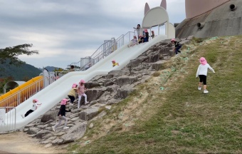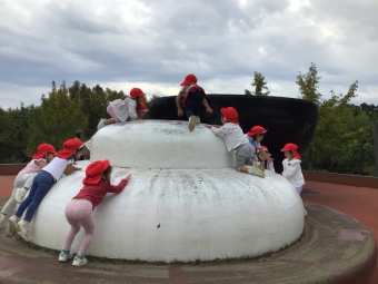 いざ公園に着くと、鬼の食卓をイメージした遊び場や迷路やカミナリが落ちる音の楽器があったり、公園の真ん中には鬼の山もあり、色々なところでたくさん遊ぶことが出来ました。不安定な天候でしたが、何とか持ち堪え、お弁当も食べて帰ることが出来ました。