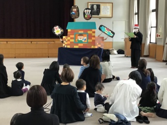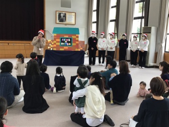 甲南女子大学のボランティア部の方が、「まどからのおくりもの」というパネルシアターをしてくださり、みんなとても喜んで見ていました。その後「赤鼻のトナカイ」の歌に合わせてダンスをしたり、楽器を鳴らしたりして楽しみました。クリスマスプレゼントに「かぶとん」(甲南小学校・幼稚園のマスコットキャラクター)のミニタオルや、ボランティア部の方が作ってくださったペンダントをもらいました。