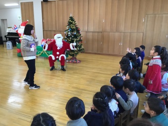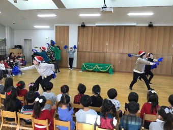 今日は子どもたちがずっと楽しみにしていたクリスマス会でした。遊戯室もいつもとは違い、クリスマスの装いです。クリスマス会では、先生たちからのダンスのプレゼントがあり、次に子どもたちが「あわてんぼうのサンタクロース」を歌いました。歌を歌っていると、シャンシャンシャンという鈴の音が...!!