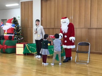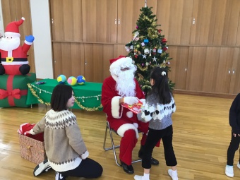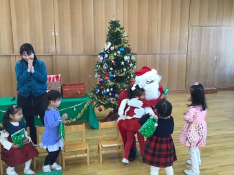 幼稚園には「ボール3つ」と「空気で膨らむサンタさんの飾り」のプレゼントを。そして各クラスへもプレゼントを。最後に一人一人にプレゼントをいただいて、ハグや握手もしてもらい、ドキドキしながらも大喜びの子どもたちでした。