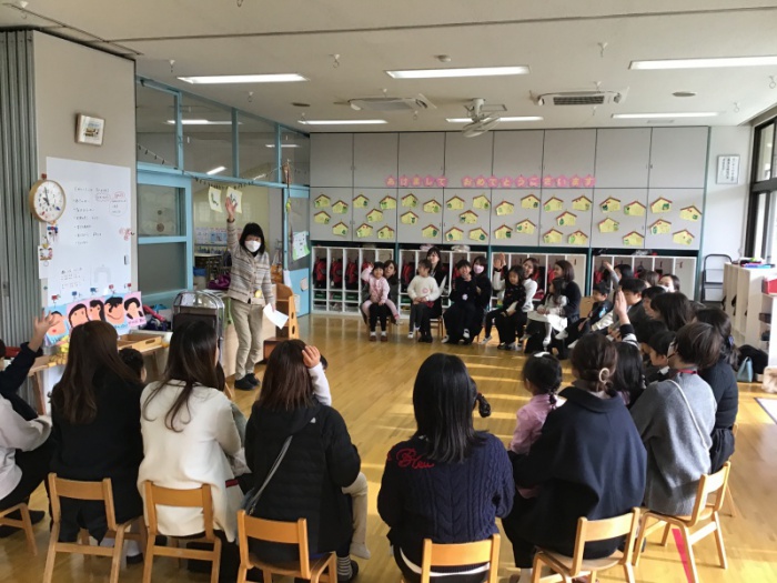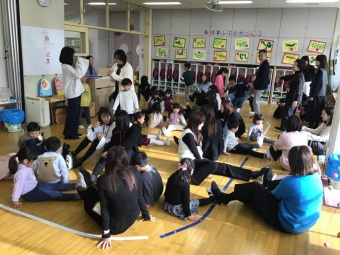 今日は今年度最後の参観日となかよし会(縦割り保育)の保護者参加が行われました。各クラスで、朝の準備の様子などを参観していただいた後、各チームに分かれて、保護者の方に参加していただき、一緒にゲームをして楽しみました。子どもたちは、お家の方と一緒に遊べて大喜びでした。