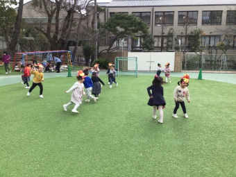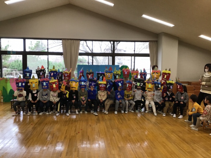 自分たちで作った思い思いの鬼の面を見せ合い、最後はみんなで年長さくら組さんが扮する鬼を「鬼は外!福は内!」と何度も声をかけて追い払いました。