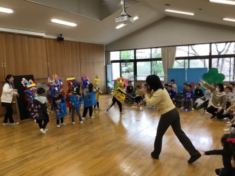 今日は学園長先生も来てくださり、先生から節分の由来のお話を聞きました。その後、ペープサートの鬼の話を見て、みんなで楽しみました。