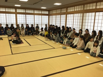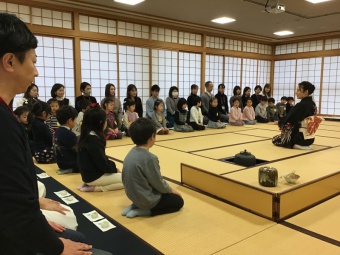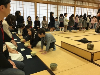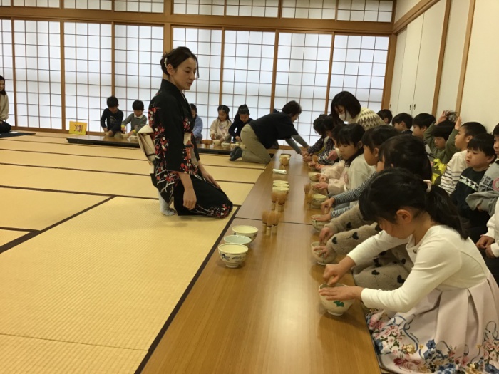 すみれ組は初めてお薄をいただきました。たんぽぽ組は保護者の方へお薄をお運び、さくら組は自分で点てたお薄を保護者に振る舞いました。