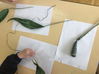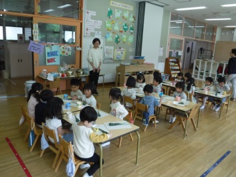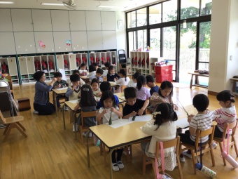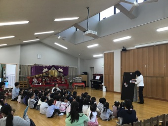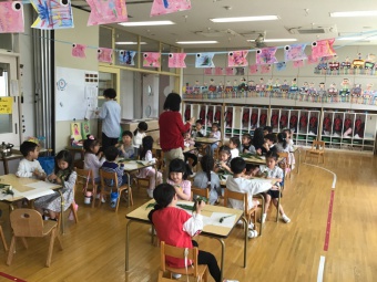 パネルシアターで、何故、こいのぼり・鎧・菖蒲・柏餅やちまき等を飾ってお祝いするのかの話を聞きました。こいのぼりの矢車がカラカラ回る音は、魔除けになり、神様を呼ぶ音でもあることも知りました。