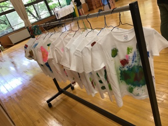 今年のテーマは「ロボット」。元気な歌声で始まったお泊まり保育の最初の活動は、ロボットTシャツ製作でした。思い思いにロボットやアンテナを描いていきました。