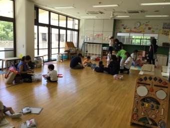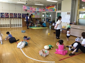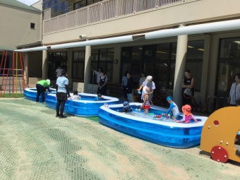 その後、園庭のゴムプールで水遊びも楽しんでいただきました。熱中症指数が危険レベルということで、園庭での遊びは中止となりましたが、室内でもたくさん遊んでいただきました。