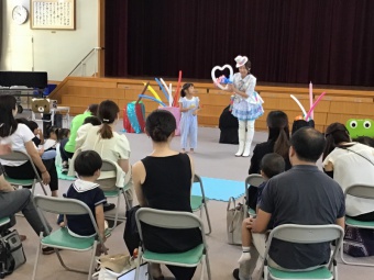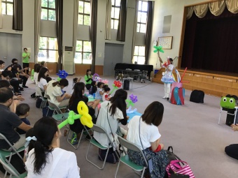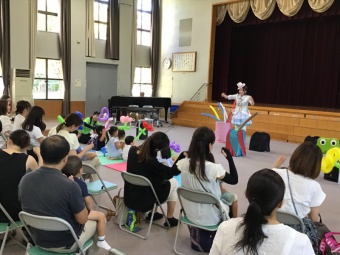 歌やダンスに合わせながら、風船で色々な物を作って、プレゼントしてもらって、大喜び。途中、お父さんのダンス参加もあり、和やかな雰囲気に包まれて、楽しいひとときとなりました。