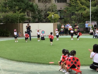 年少すみれ組は、初めての大きな行事!初めてたくさんのお客さんの前ではありましたが、テントウムシに扮してかけっこと玉入れに取り組みました。