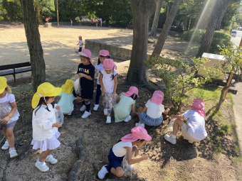 公園に着いてからは、遊具のある場所で遊んだり、どんぐりやまつぼっくり拾いをしたりと思い思いに遊びました。