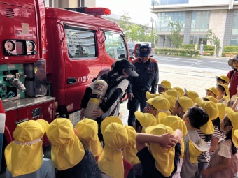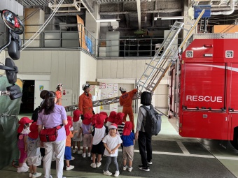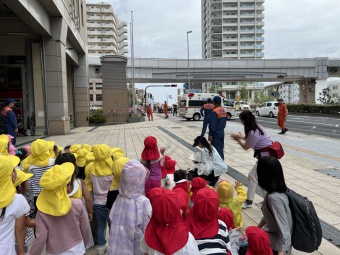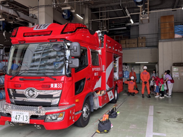 避難訓練の一つとして、東灘消防署に見学に行きました。消防車に乗せていただいたり、実際に使っている道具に触わらせていただいたり、お話を伺ったり、消防士さんやレスキュー隊員さんからたくさんのことを教えていただき、とても貴重な経験をさせていただきました。見学中には、実際に救急車両が出動する場面にも遭遇しました。