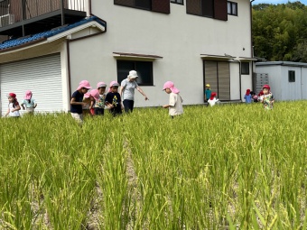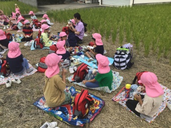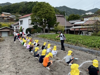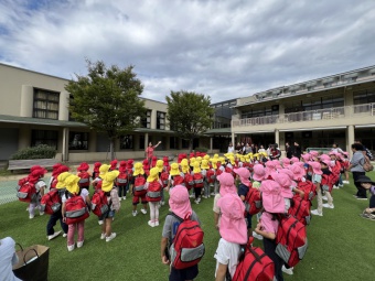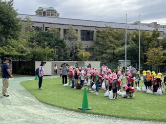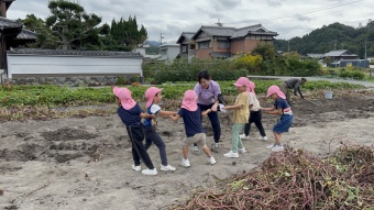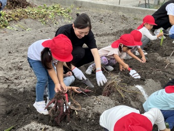 今日は、全園児で大型バスに乗っていも掘り遠足に出かけました。バスガイドさんと手遊びやクイズを楽しみながら向かい、橋本農園さんに到着。いも畑では、スコップを持ってうんとこしょ!どっこいしょ!と、力いっぱい土を掘りました。すると、大きなさつまいもがたくさん!!みんな大喜びでした。いも掘りが終わった後は、おにぎりとおやつを食べて、虫探しをしたり、いものつるで綱引きをしたり、秋の自然に触れて走り回って遊びました。さつまいもが入ったお土産の袋は重かったですが、みんな誇らしげに運んでいました。24日には、みんなで掘ったさつまいもでさつま汁クッキングをする予定です。今からとっても楽しみです!
