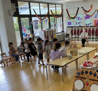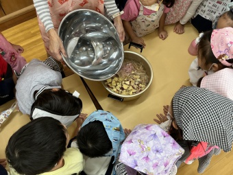 先日の芋掘り遠足でたくさんの芋を掘って帰ってきた子どもたち。幼稚園にもたくさんの芋のお土産を持って帰り、みんなでさつま汁を作りました。