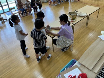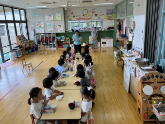今回は、縦割り保育「なかよし会」のメンバーと一緒に作りました。今年度初めてのクッキングにワクワクしている子どもたちでしたが、しっかりと約束を守り、野菜を切っていきました。サツマイモは、固くて少し力もいりましたが、みんな上手に切ることができました。野菜にもいろいろな固さがあるという発見もあり、この経験が今後、様々なことに繋がればいいなと思います。