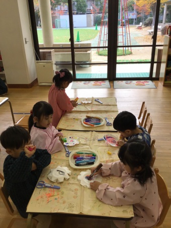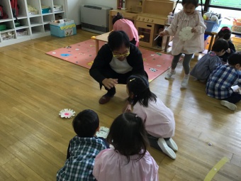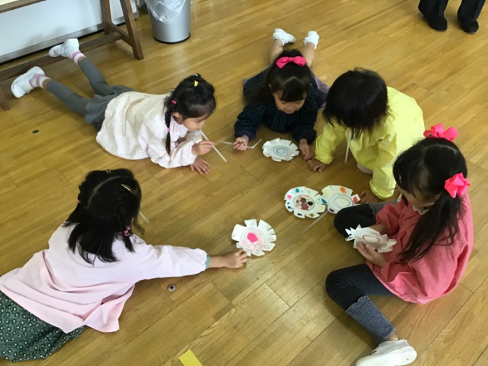 年少すみれ組では、紙皿とストローを使って「吹きゴマ」を作りました。紙皿がコマのようにクルクル回る様子に興味津々。始めにはさみの使い方(刃先・真ん中・奥の用途の違い)を教えていただき、作り始めました。紙皿を切ったり折ったり、ストローでコマを吹いて回したり、難しい様子も見られましたが、自分だけのコマを完成させ、くるくる回るコマに歓声があがりました。腹筋を使って吹く力も付きました!