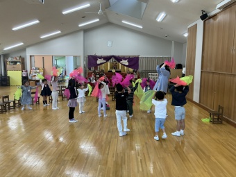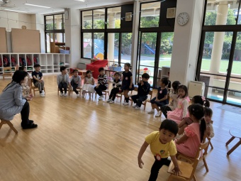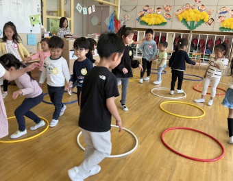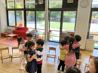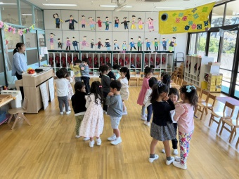 今年度、初めてのなかよし会を行いました。なかよし会は、3歳から5歳の縦割りで、赤・黄・青・白チームに分かれて活動をします。今日はこれから一緒に遊んだりお弁当を食べたりする異年齢のお友達と顔合わせをしました。普段と違う友達や先生と「これから1年間よろしくね」と手を繋いでなかよし遊びやゲームをして過ごしました。