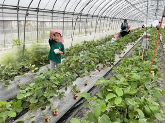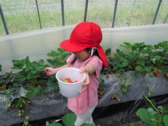 いちご畑に到着するとおいしいいちごの匂いが漂ってきました。「早く食べたい!」と待ちきれない様子の子どもたち。口の周りや洋服を真っ赤に染めて、いちご狩りを満喫しました。大きな口を開けていちごにカプッとかぶりつく子どもたちの様子はとても微笑ましかったです。