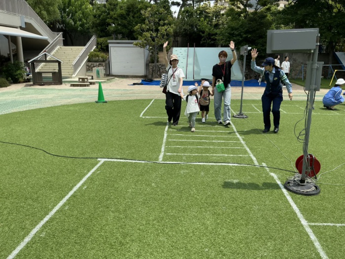そして、最後に園庭で歩行訓練を行いました。交通指導員の方に教えていただいた ①止まる ②右左右を見る ③手をあげて渡る の約束をしっかり守って、横断歩道を渡ることができました。特に、青信号でも「まず止まる」ということは、大人でも忘れがちです。