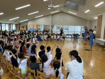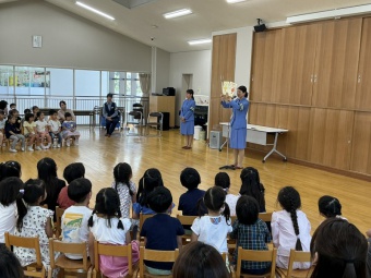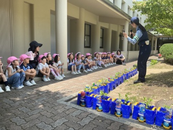 今日は東灘警察署の方に来ていただき、交通安全教室を行いました。全園児と全学年の保護者が参加しました。