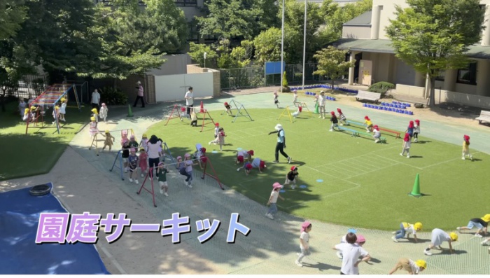 お天気の良い日には、全園児が園庭に集まり、朝の会の時間に「園庭サーキット遊び」を行っています。 安田式遊具を使って、鉄棒や雲梯、体幹を使った運動などに取り組みながら、楽しく体づくりをしています。