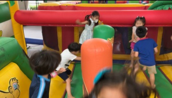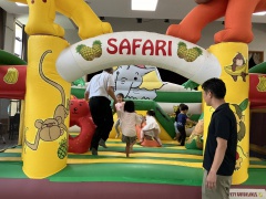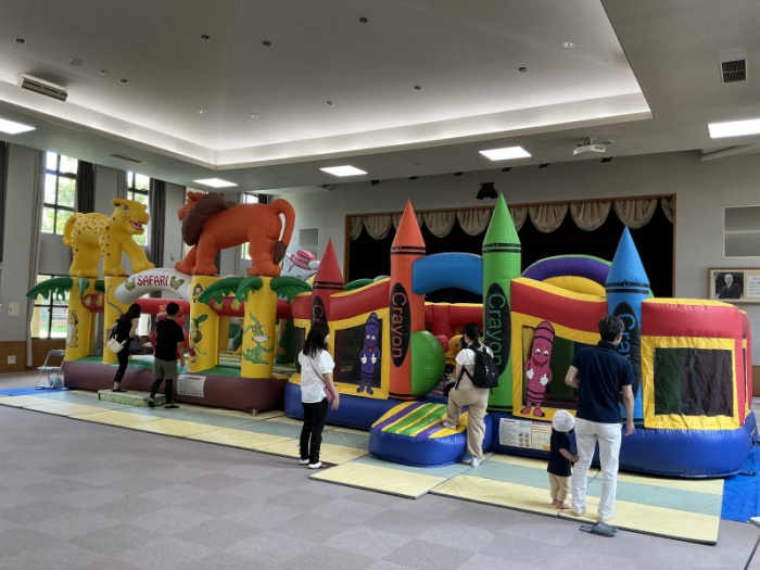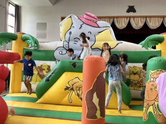 今日はエアー遊具「ふわふわキッズランド」がやってきました。講堂に設置された大きなふわふわの遊び場に大興奮の在園児たち。汗だくになりながら、跳んだりはねたり滑ったりとたくさん体を使って遊びました。楽しい時間はあっという間で、「もっと遊びたい~!」と言う子どもたちでした。