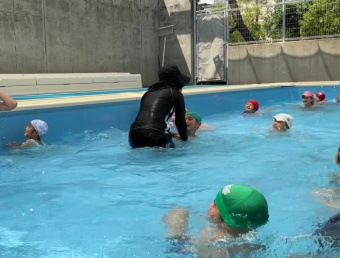 小学校プールでのプール保育が始まりました。幼稚園は小プールの水量を減らし、入水しています。