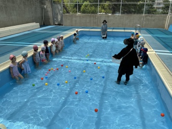 今日は年少すみれ組も初めてプールに入水しました。プールまでの道中・プールサイド・着替えの仕方・入水中等の約束事を覚えることから始まります。