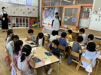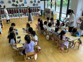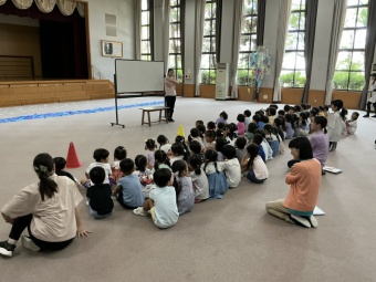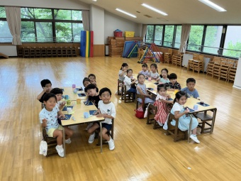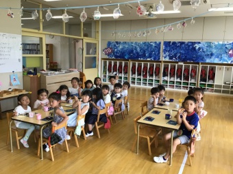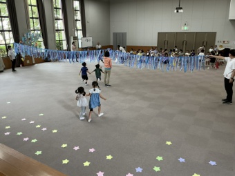 みんなで講堂に集まり、七夕のお話を聞きました。その後、講堂は空の部屋に大変身!天の川をくぐってお星様を取るゲームに挑戦しました。子どもたちは織り姫と彦星に変身して仲良く手を繋ぎながら天の川を渡って星を取りに行きました。最後は、星を手に持って、「たなばたさま」を歌いました。織り姫様と彦星様に届くぐらい素敵な歌が部屋の中に響きました。