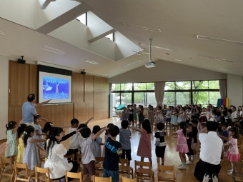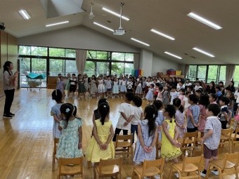 園長先生からは早寝早起き、お手伝いについて、靴を揃えましょう、など夏休みの過ごし方についてのお話を聞きました。みんなとても真剣に聞いていました。