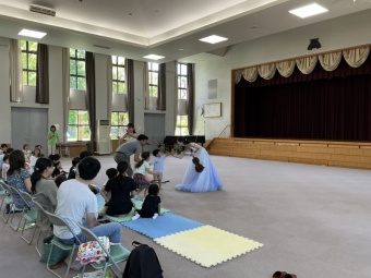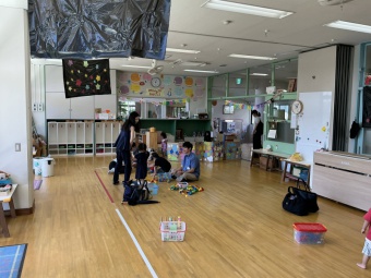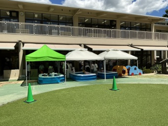その後は、園庭や保育室などで好きに遊んでいただきました。園庭ではビニールプールを用意し、水遊びも楽しんでいただきました。暑い中、ご参加いただいきありがとうございました。