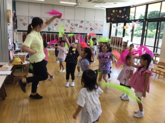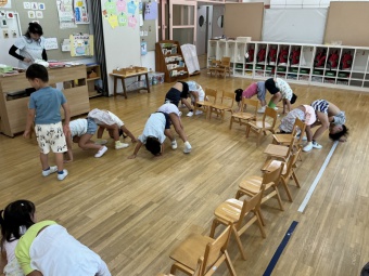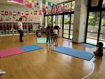 2学期に入ってから初めての縦割り保育「なかよし会」がありました。今回はゲームやダンス、友達と楽しさを共感しながら遊ぶ「共感遊び」などをし、チームごとに過ごしました。久しぶりに顔を合わせて、始めはちょっぴり恥ずかしそうにしているお友達もいましたが、一緒に過ごしているうちに、にこにこ笑顔で遊ぶことができました。