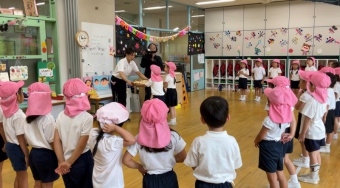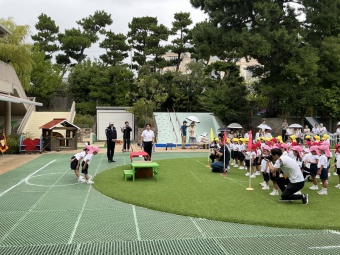 また、未就園児のお友達も運動会に参加し、一生懸命走ってくれました。年長さくら組のお兄さんお姉さんからくるくる回る風車をもらって嬉しそうな姿が印象的でした。