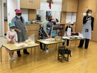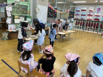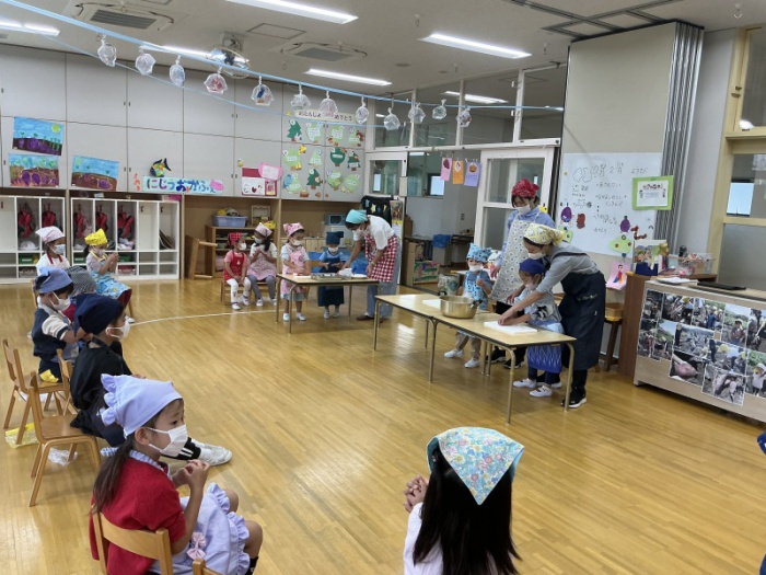 先日の芋掘り遠足で収穫したお芋を使ってクッキングをしました。メニューは「さつま汁」。お手伝いのお母さんにも協力していただき、チームのお友達と力を合わせて作りました!
