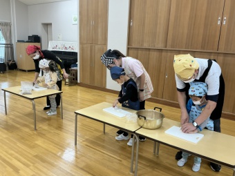 包丁を使うので約束や切り方を先生から教えてもらい、気をつけながら具材を切りました。野菜によって固さが違うので、「わあ~!固い!」と切れる感覚を楽しんでおり、たくさんあった野菜はあっという間に切れてしまいました。