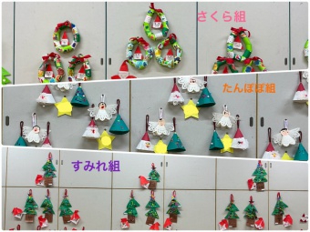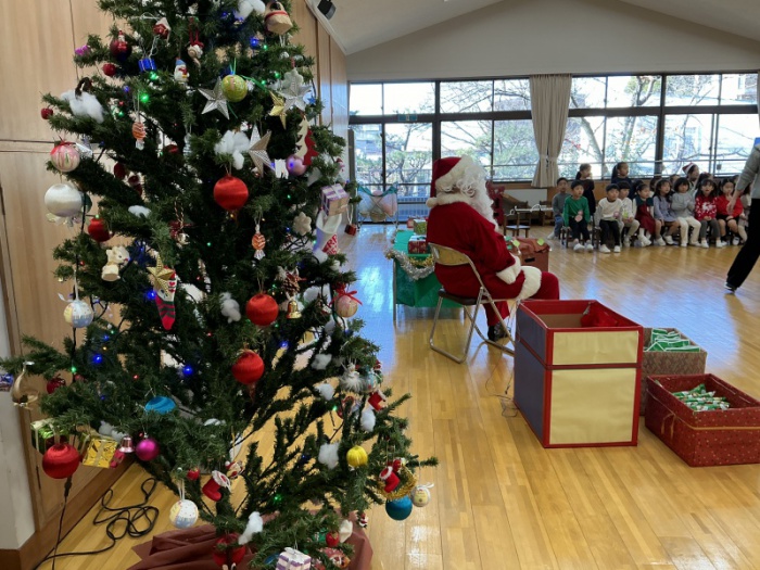 今日はクリスマス会でした。サンタさんが来てくれるようにと願いながら、12月の初めから園にある大きなクリスマスツリーに飾り付けをしたり、クリスマス飾りの製作をしたりして心待ちにしていました。