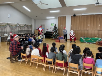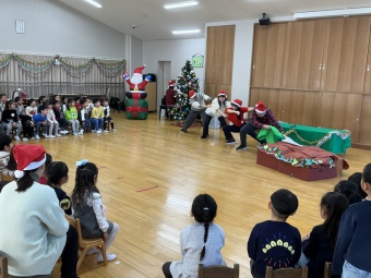 クリスマス会では、歌「あわてんぼうのサンタクロース」を歌ったり、先生達によるお話劇「おおきなかぶ」を見たりして過ごしていました。