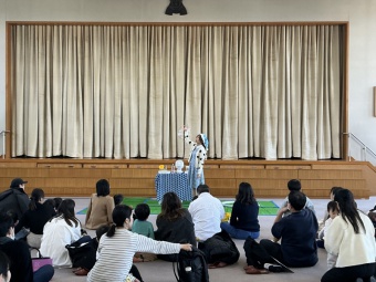 今回は、“ふわりん先生”のシャボン玉ショーで楽しくスタートです!楽しいショーに興味深々の子どもたち。いろいろな大きさのシャボン玉に歓声があがっていました。最後は、みんなでたくさんのシャボン玉を手でパチンと割って遊びました。参加型の楽しいショーとなりました。