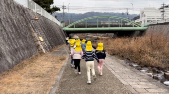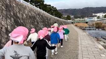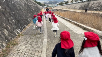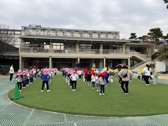 幼稚園では日頃から体力作りに励んでおり、3学期からはマラソンをスタートさせました。住吉川沿いを走る『がんばりマラソン』に向け、1曲半(約7分)園庭をマラソンし体力をつけていきました。