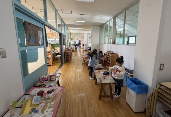 今日は登園後から9時30分までの朝の時間に、「なかよしタイム」を行いました。この活動は、クラスの枠を超え、どの保育室へ行って遊んでも良い特別な時間です。子どもたち自らがかかわりを広げ、遊びを選ぶことを大切にしています。