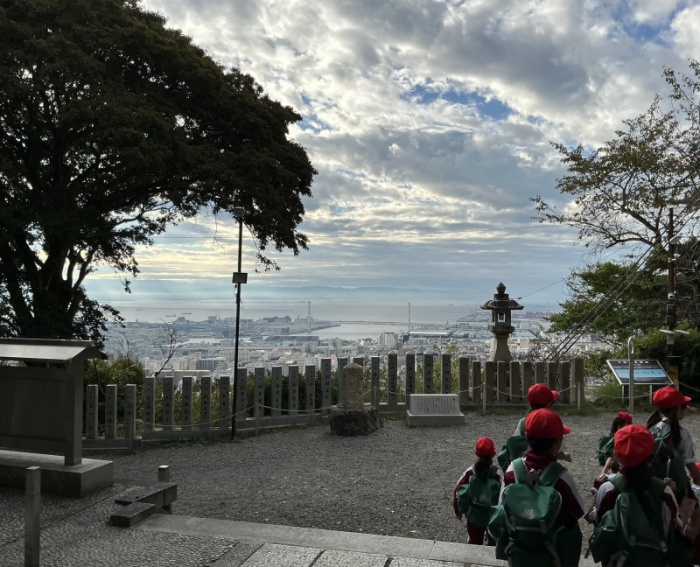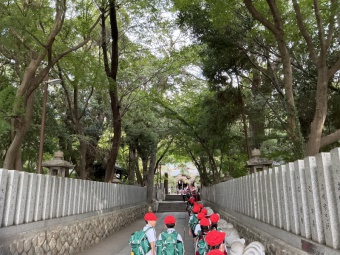 子ども達は、まだ外が暗い時間に家を出て、午前6時30分に学校に集合します。早朝の静けさを楽しみながら、学年ごとに保久良神社まで約4キロの道のりを歩きました。