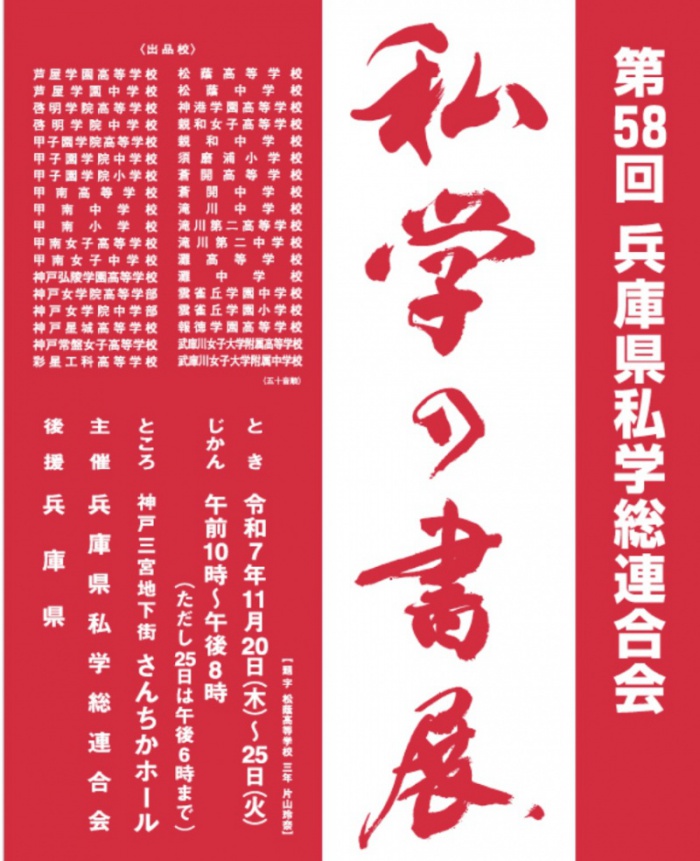 兵庫県私学総連合会主催の「第58回 私学の書展」が、神戸三宮地下街「さんちかホール」にて11月20日(木)~25日(火)に開催されています。