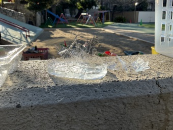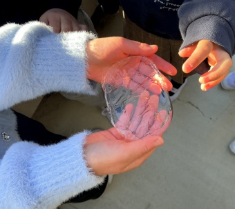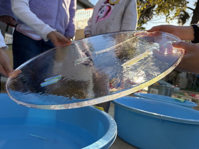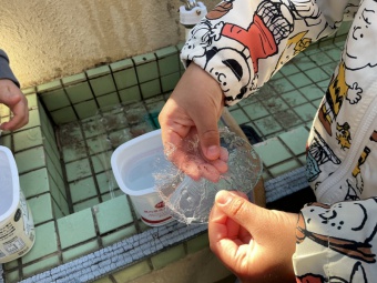 翌朝、登園してきた子どもたちから「先生ー!氷ができてるー!」と、嬉しそうな声が響きました。