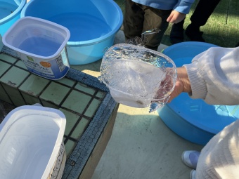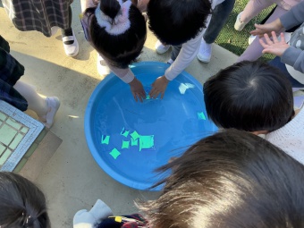 その様子を見ていた年中たんぽぽ組の子どもたちも「一緒に氷を作りたい!」と興味をもち、グループごとに氷作りを始めました。さらに、年少すみれ組では「クラスみんなで作ってみよう!」と、タライに水を張って準備完了です。