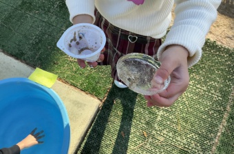 さっそく園庭に出てみると、大きな氷、小さな氷、さまざまな形の氷ができており、子どもたちは興味津々。「冷たーい!」と言いながら、触ってみたり、形をよく見たりと、氷の感触や変化を夢中になって観察していました。