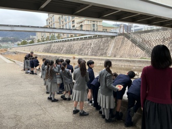 今日は、ひな祭りの原型である「流し雛」という祓いの行事も体験しました。自分達で人形を作成し、折り紙に書いた願い事と人形を桟俵に乗せて住吉川に流しに行きました。